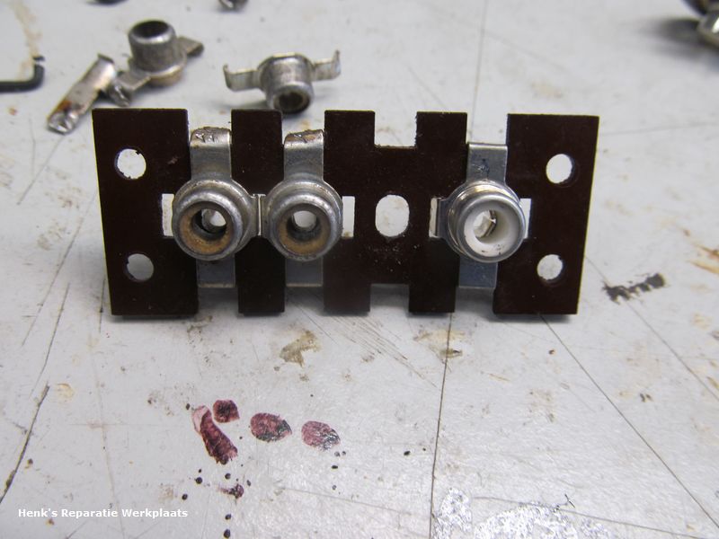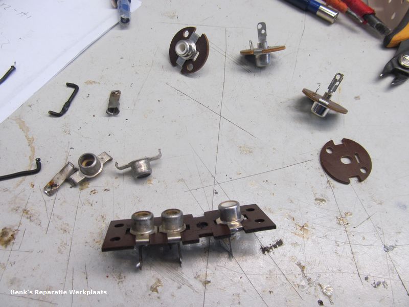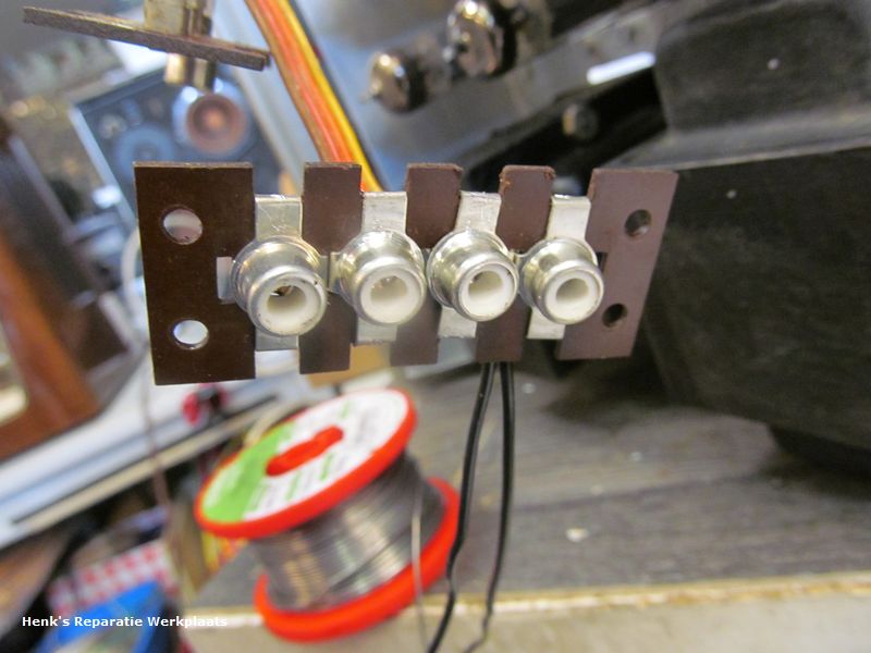 De versterker was alweer terug naar de eigenaar. Helaas was een nieuwe weerstand (het kapje) afgebroken. Dit hersteld en toen ook maar de ingangsbussen aangepakt. De connectie was niet meer in orde. Via het www ronde bussen gevonden. Door deze te demonteren en over te zetten op de bestaande pertinax\hardpapier plaatjes kon het geheel origineel blijven.