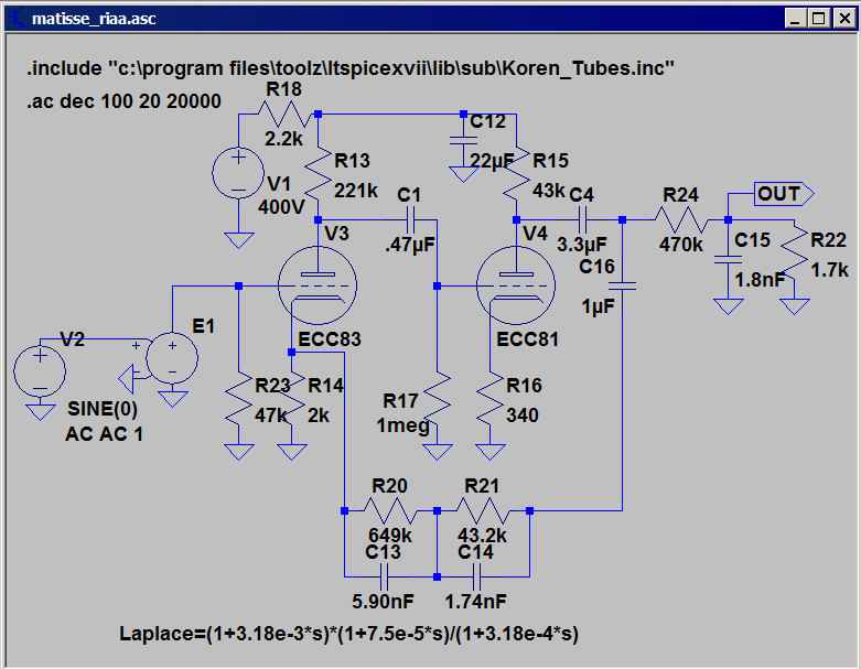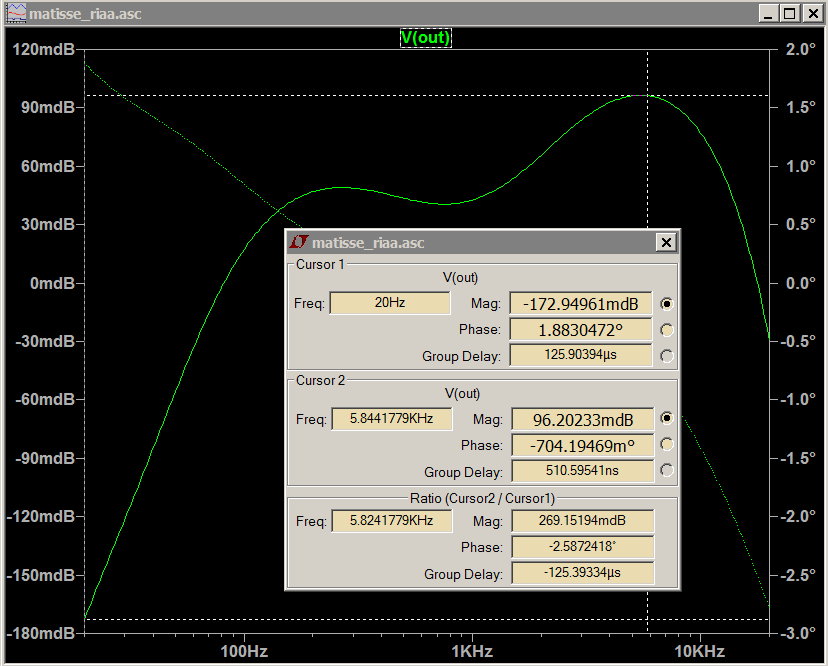 Inderdaad, met R19=11k wordt-ie een stuk vlakker. Bij 20 Hz en 56k -2.5 dB tov. 1 kHz, met 11k -0.8 dB @20 Hz. Begrijp alleen niet goed waar die afwijking in het laag vandaan komt. Als ik een "officieel" RIAA netwerk gebruik (920k//3.45nF+75.0k//1.00nF) kom ik op ongeveer hetzelfde uit. Prik ik een ECC82 (V4) erin wordt de afwijking 9 dB. Vaag. Doe ik dit netwerk met een nette opamp (NE5532) is-ie vlak op 0.2 dB van 20-20kHz. Met een LT1222 is-ie zellufs 42mdB. Tja...