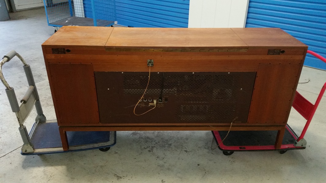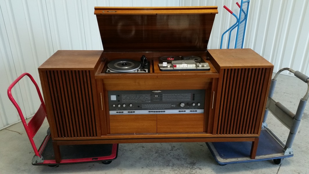 Kan hem daar verder ook niet meer testen, bij de vorige eigenaar even kort gehoord op de middengolf en dat was prima. Op de FM weinig tot niets te horen. Platenspeler zou het moeten doen maar dat is helaas niet de originele maar een Dual 1224. Bandrecorder mist een knopje en een knop op het radio/versterker gedeelte mist een afdekkapje. Verder is het meubel in goede staat met enkele kleine gebruikerssporen en vooral nog wat stoffig en smerig.