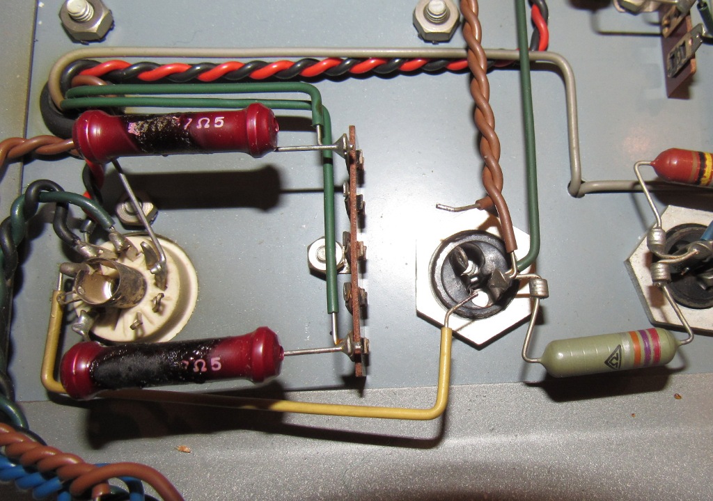 De zwart geblakerde 47 Ohm weerstanden hebben de strijd overleefd, die meten nog keurig 47 Ohm.