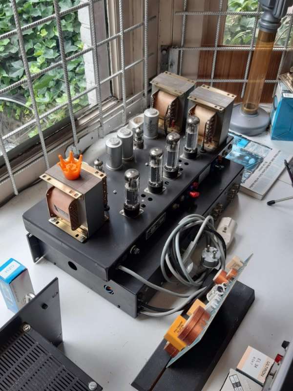Dhr. Maijer heeft twee M90 Multitone versterkers voor mij in orde gemaakt. Ik had al een aantal modellen zoals M50, M75 en M100. De M90 haalt de 90 Watt uit 2x EL34 dankzij de hoge anodespanning van circa 800V. De M100 levert 100 Watt, heeft een lagere voedingsspanning en daarom 4x EL34.