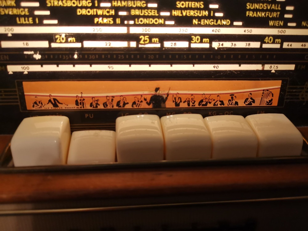laten we zeggen dat de zendernamen er in het midden afvallen ..zo hard bladderd hij af . Aan de zijkanten is hij nog goed. Jouw schaal ziet er heel netjes uit vind ik. Jammer dat ben Dijkman deze niet laat bedrukken.. ik wil de radio graag van je overnemen, dat het en rode schaal is vind ik dan veel minder erg. En de achterwand, deze zijn quasi het zelfde