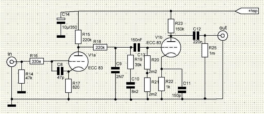 Heb hier bewust gekozen voor Riaa filtering tussen de buishelften van de ECC83 ,zodat zowel de belasting aan de in en uitgang