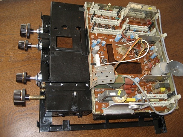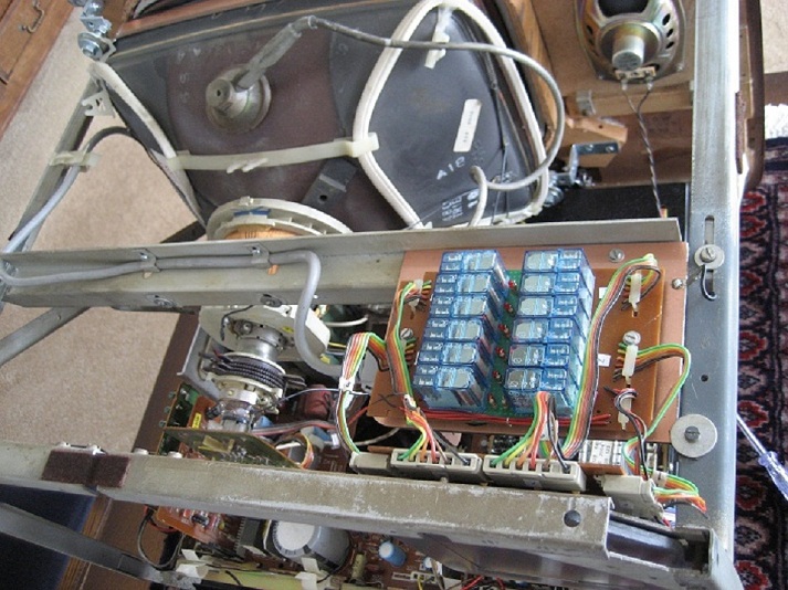 Daarna het cassis deel gemonteerd. De kanaal kiezer onderdelen verwijderd alleen de draai trommel als schakel paneel laten fusioneren.als oud uit kan men nu de kanaal kiezer draaien voor andere zender van 1 tot 13 dat word met de relais geschakeld. de afstemming van de kanalen zit achter de tv daar na heb ik een AV kan in gemaakt en komt op Kan 12 binnen.Want kan 13 is Ned 1 kan 2=2 3=3 en verder......
