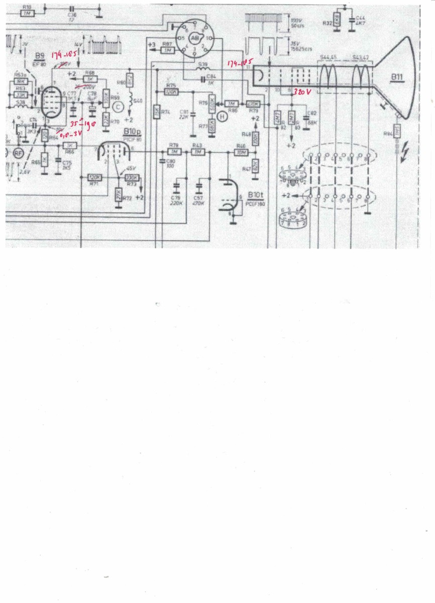 Vwb het schema: ik ben zo vrij om aan te constateren dat daar waardes staan die niet kloppen. Zo is bijvoorbeeld de anodespanning op B9 volgens het schema 100 V, maar dit is al het derde toestel van dit type waarbij ik eerder het dubbele meet.