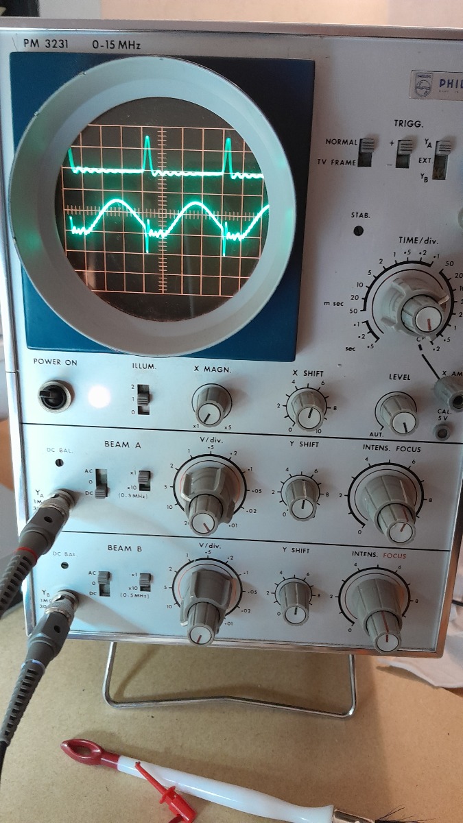 Onderstaand plaatje: op de bovenste beam de lijnpulsen (uit de lucht 'geplukt' met een los draadje in de HSP-kooi).