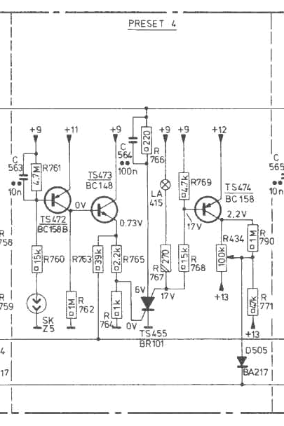 Oh ja, er trad nog een fout op. Hetzij doordat de LEDs de voeding veel minder belasten hetzij door experimenten met elco's om de oorzaak van de brom op te sporen was de stuurtor voor de 17 V voeding (TS1382) open circuit. Daardoor was die 22 V met een stevige rimpel. Die ook op de afstemspanning terecht kwam. Na een nieuwe tor meteen R1433 weggeknipt. Niet meer nodig. TS1381 blijft nu koel. Verder is TS472 slecht (tiptoets 4). Is ongevoelig. Als ik zin heb vervang ik hem nog weleens.