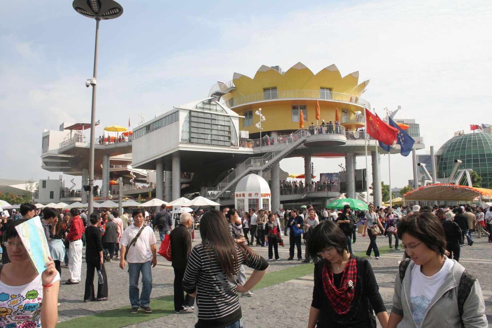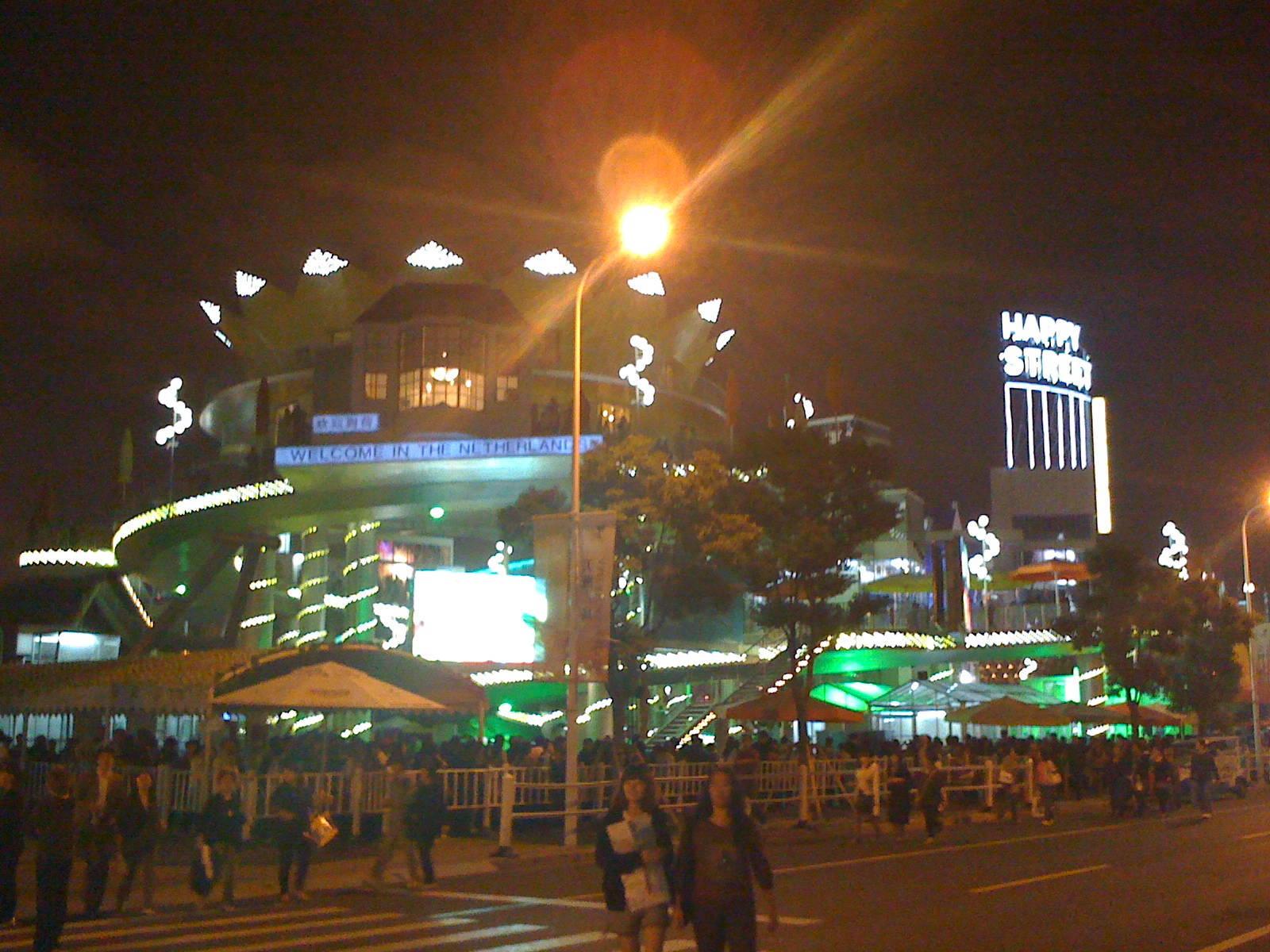 in het gebouw (Happy Street) over een slingerend pad. Alle andere paviljoens