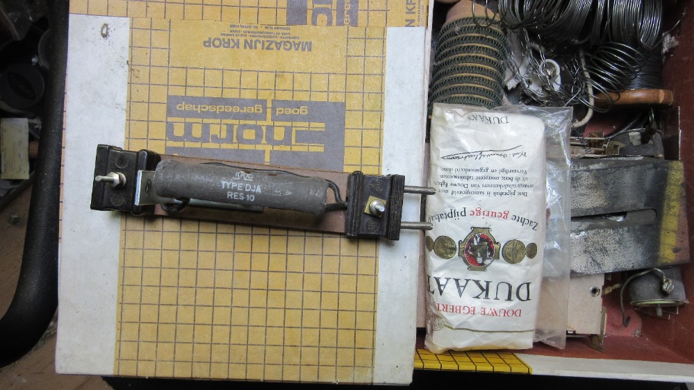 ]Als men weet dat je iets met radio doet krijg nog wel eens wat.Al weer heel wat jaren terug kreeg ik een stapel (sigaren) en andere doosjes met de nodige radio en tv lampen en ook dir doosje met allerlei weerstanddraden, strijkboutelementen met mica en ook (niet verder vertellen!!) plaatjes asbest, vroeger heel normaal in oa strijkbouten ed.Ok dit hulpmiddel waar wij vaak een gloeilamp voor gebruiken zat in dit doosje.De vroegere monteurs waren ook niet gek.