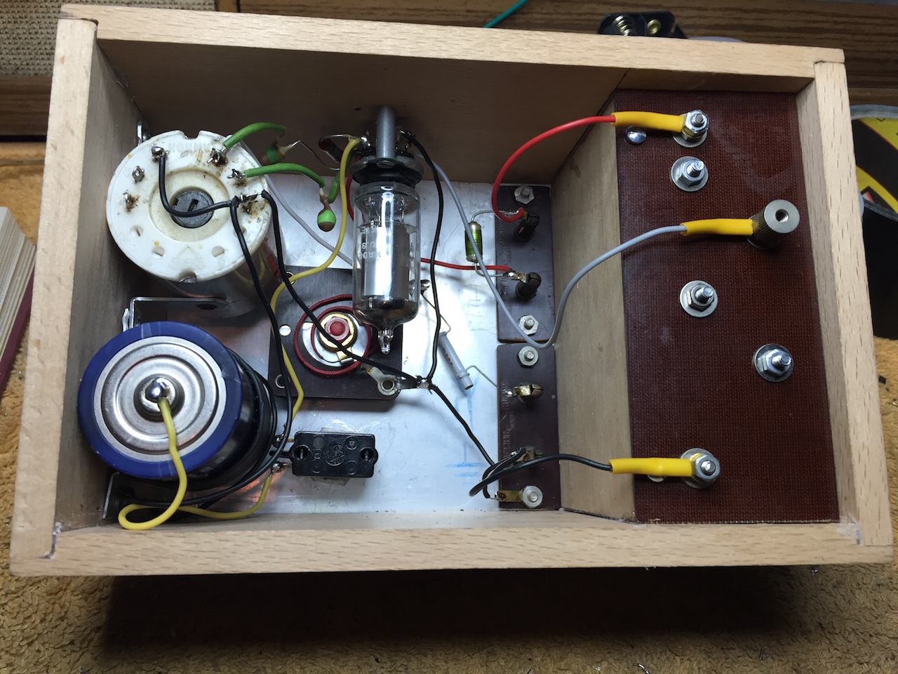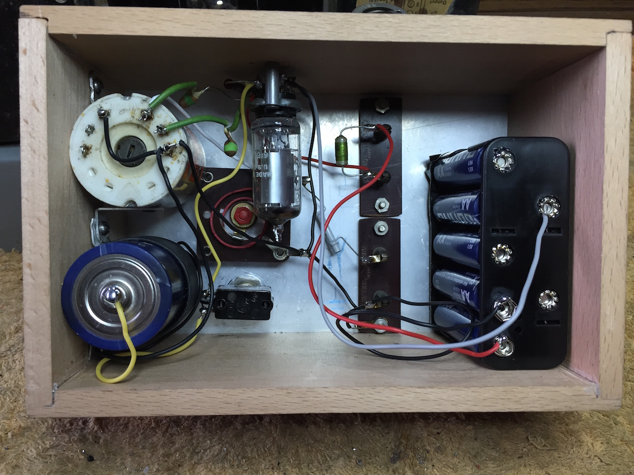 Ik heb in eerste instantie de anode - en schermroosterspanning van een regelbaar voerinkje afgenomen. Het viel me in eerste instantie erg tegen: Het ding gilde constant en wilde pas redelijk werken als ik de schermroosterspanning op 6 V. instelde. Het had dan echter nog steeds de neiging tot genereren en het geluid was ook niet al te best.