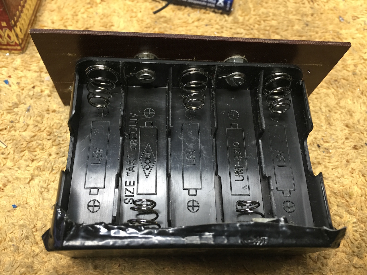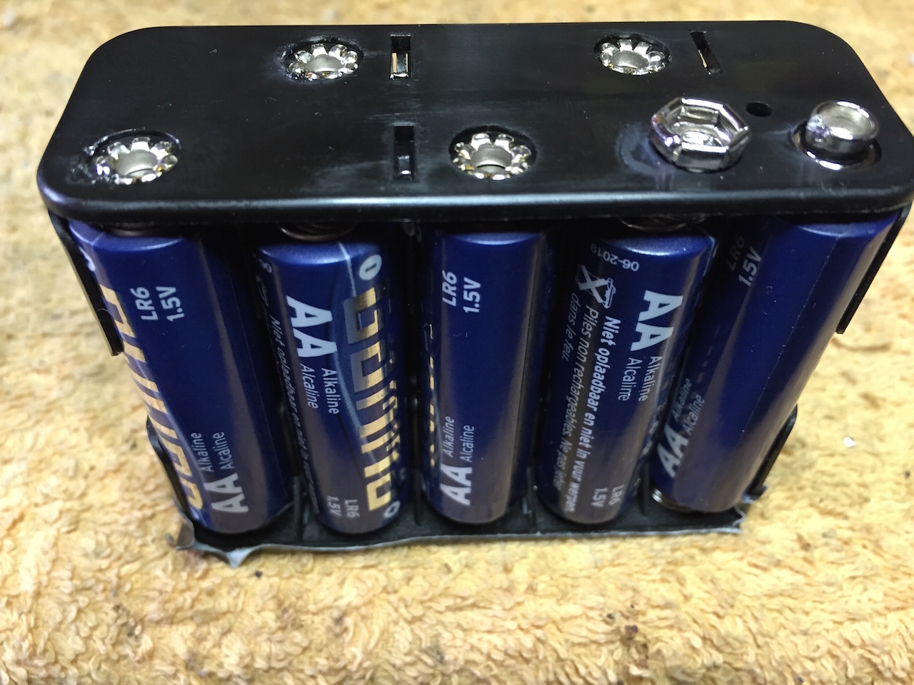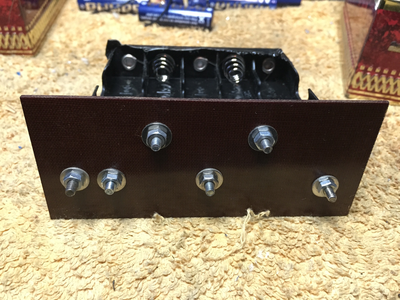 Op de batterijhouder waren op simpele manier extra aansluitingen te maken d.m.v. boutjes met verzonken kop en moertjes.