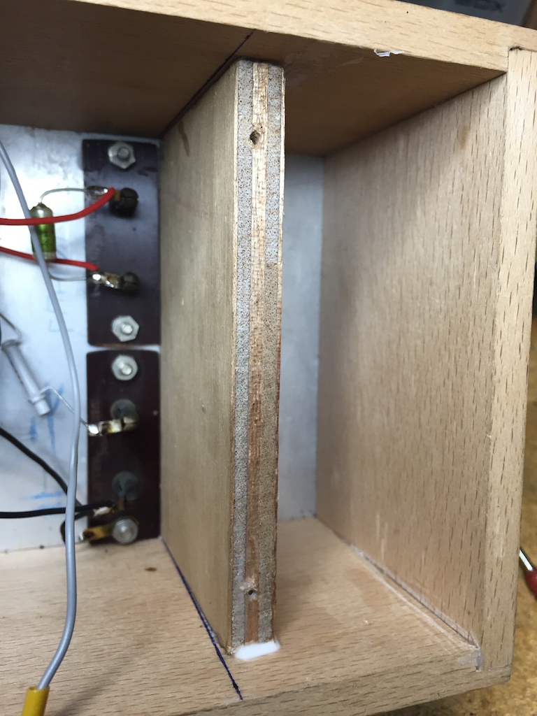 In het kastje heb ik nu een extra schotje gelijmd, zodat a.h.w. een batterijvak ontstond: