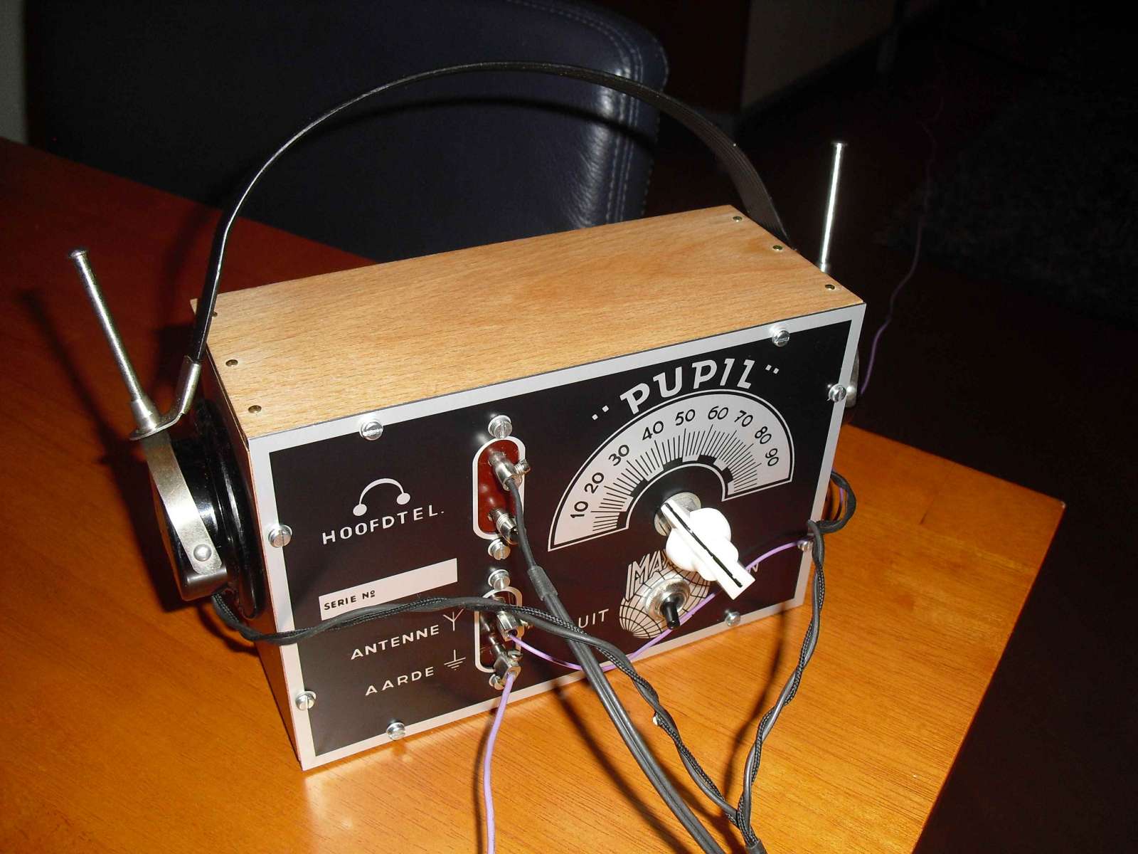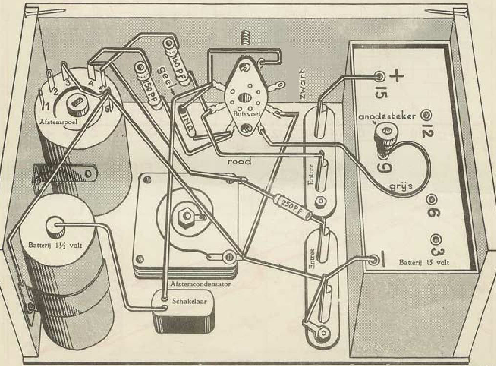 De bedradingstekening die ik pas hier nog heb geplaatst klopt niet helemaal. Als volgens deze tekening de Pupil wordt bedraad dan staan beide gloeidraden in serie en dan zal de Pupil minder goed werken omdat dan de gloeidraden maar de helft van de 1 ½ Volt zullen krijgen. Hieronder staat de aangepaste tekening.