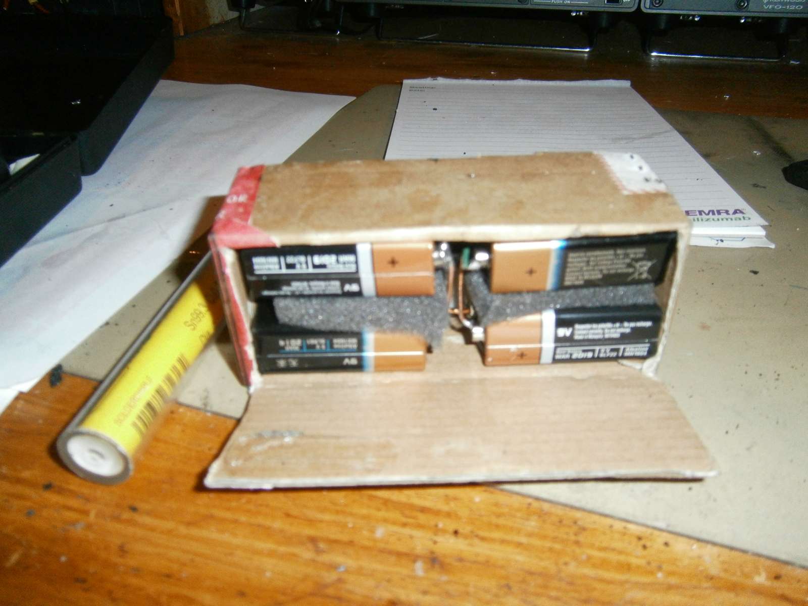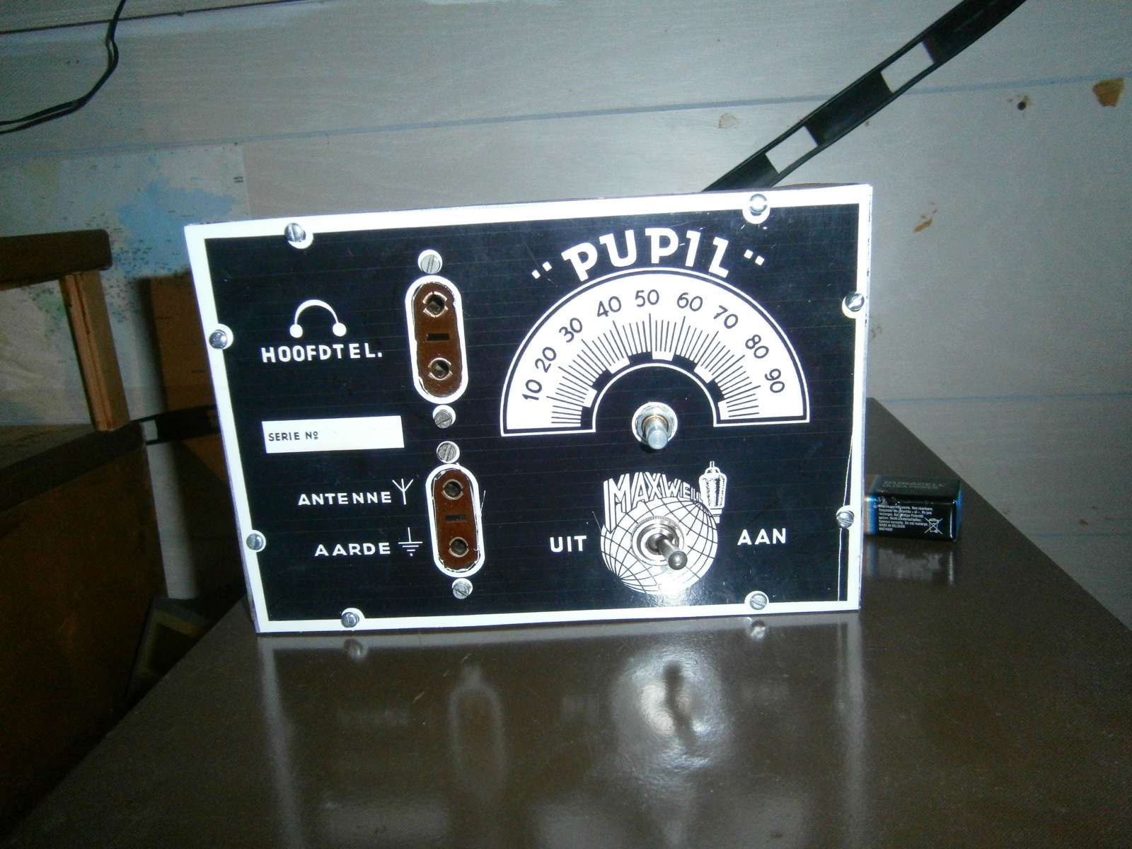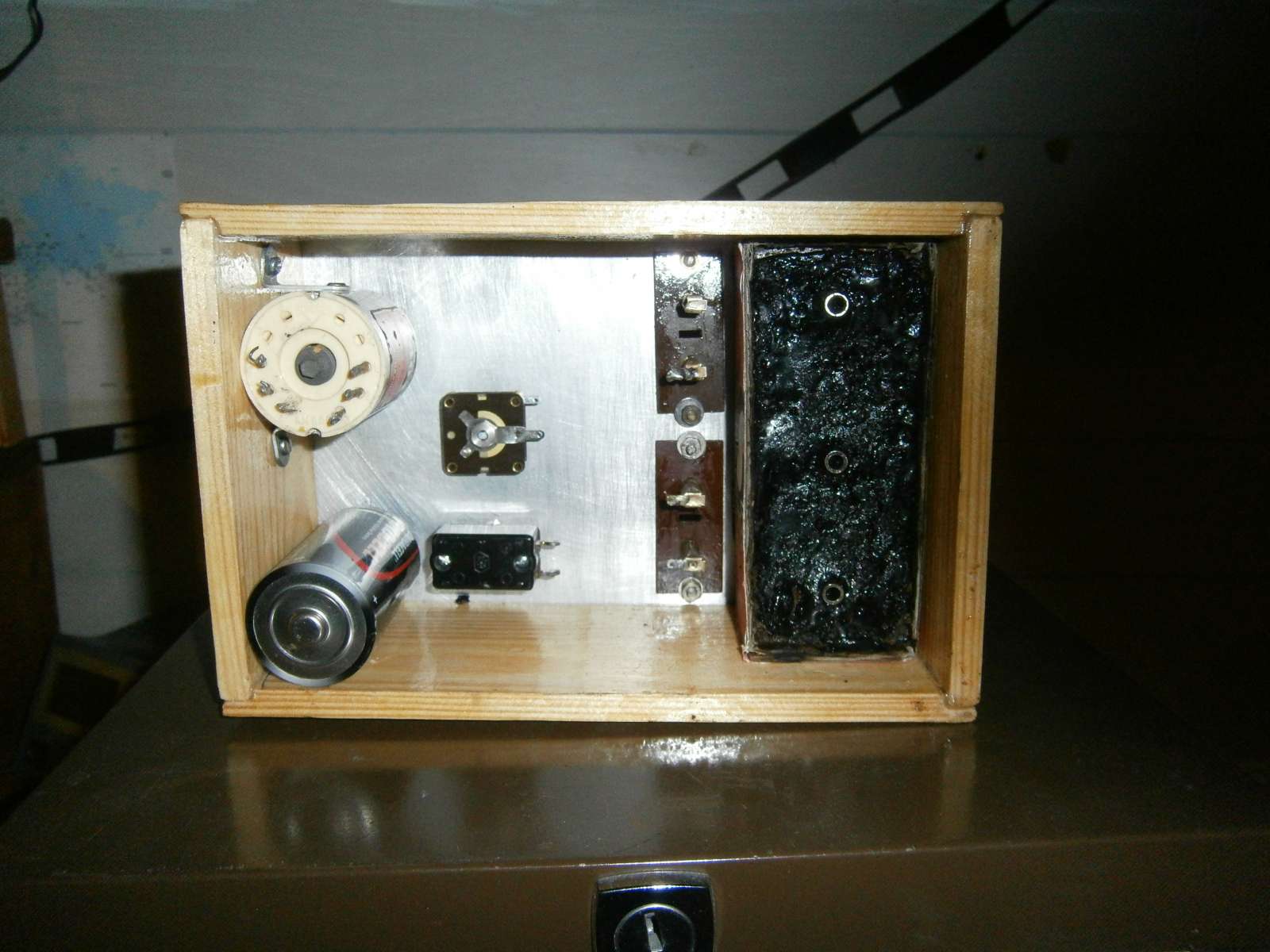 Het kastje is gereed .De 402 spoel is binnen en de dl92 plus voetje besteld. De anode batterij bestaat uit 4 blokjes van 9 v Ik moet nog een oplossng bedenken om het teer wat egaler te krijgen dat is nog niet mooi glad.
