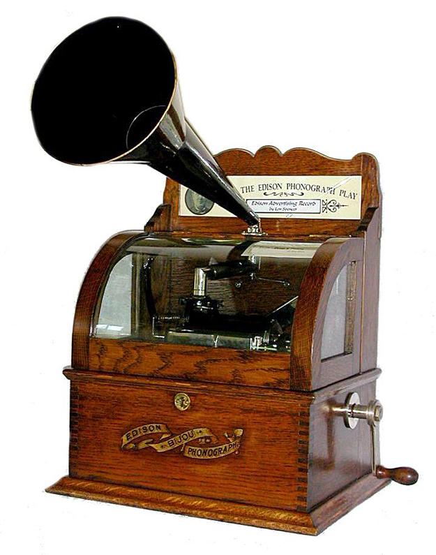 De Edison Bijou. (juweel). Een betaalfonograaf gebouwd tussen 1901 en 1908. Het mechanisme is een gemodificeerde GEM fonograaf.