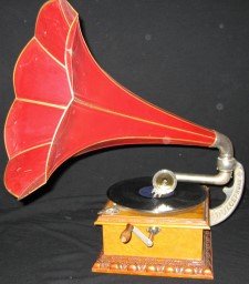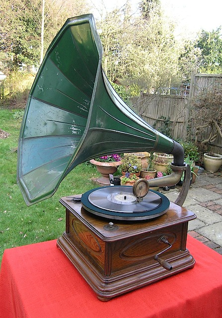 Wat denk je van deze "fraaie grammofoon met koperen hoorn" ? Is dit een echte of