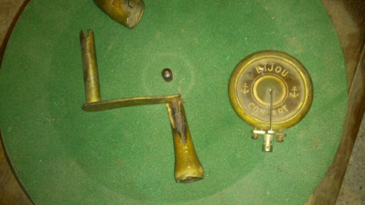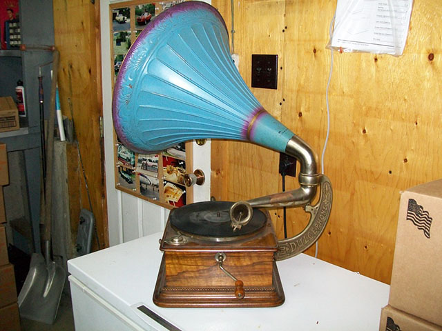 is er een messing hoorn van een phonograaf op geknutseld? Ik ben erg benieuwd...