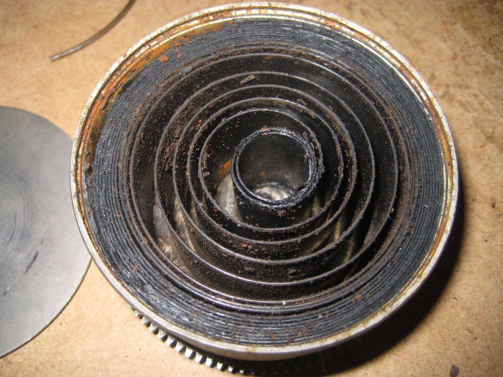 Ik heb de veer met de hand wat aangedraad waarna ik het eerste binnenste stuk voorzichtig uit de trommel kon halen, daarna krul voor krul uit de trommel en op die manier was de hele veer veilig en heel uit zijn behuizing.