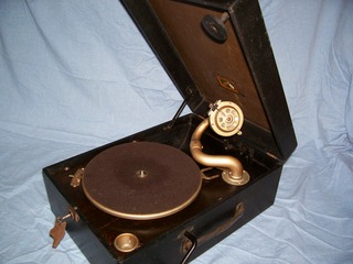 Het doek wat er oorspronkelijk op de koffergrammofoon zat was bordeau rood,maar al bijna vergaan.