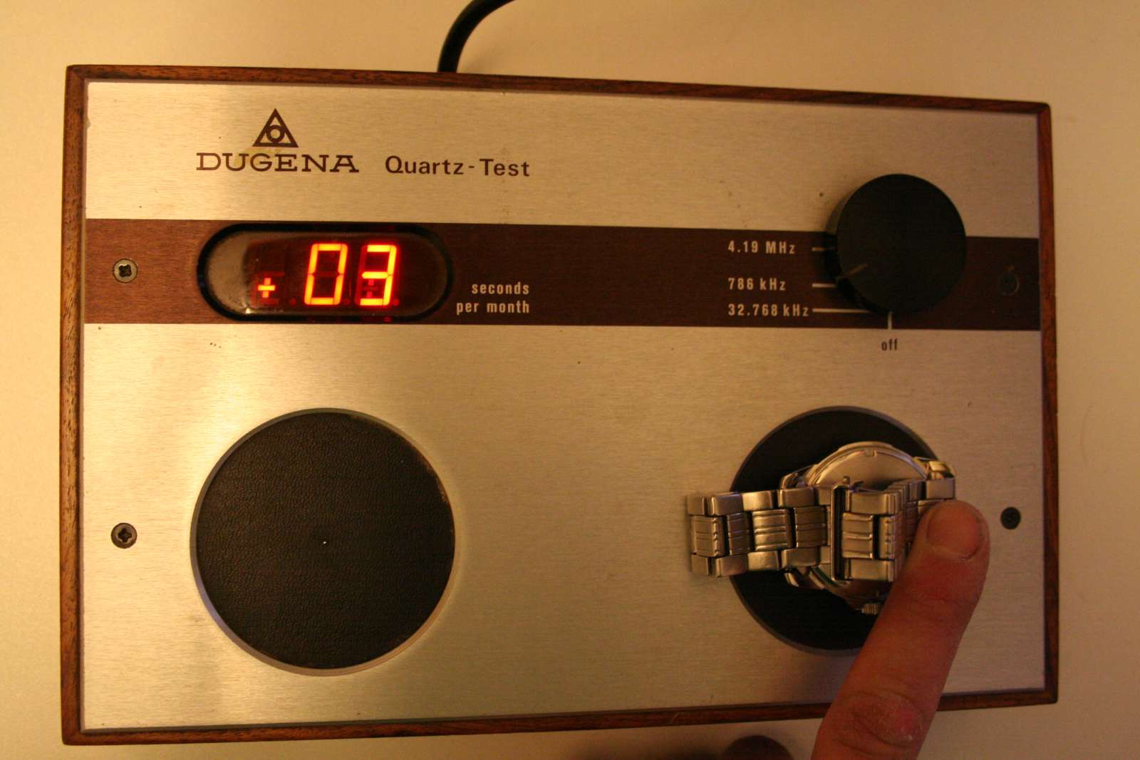 Zelf heb ik een vaag apparaat gekocht uit de 70 er jaren, waarmee je quartz klokjes kunt ijken. Je kan het cristal callibreren ofzo... Dat moet ik nog even uitzoeken.