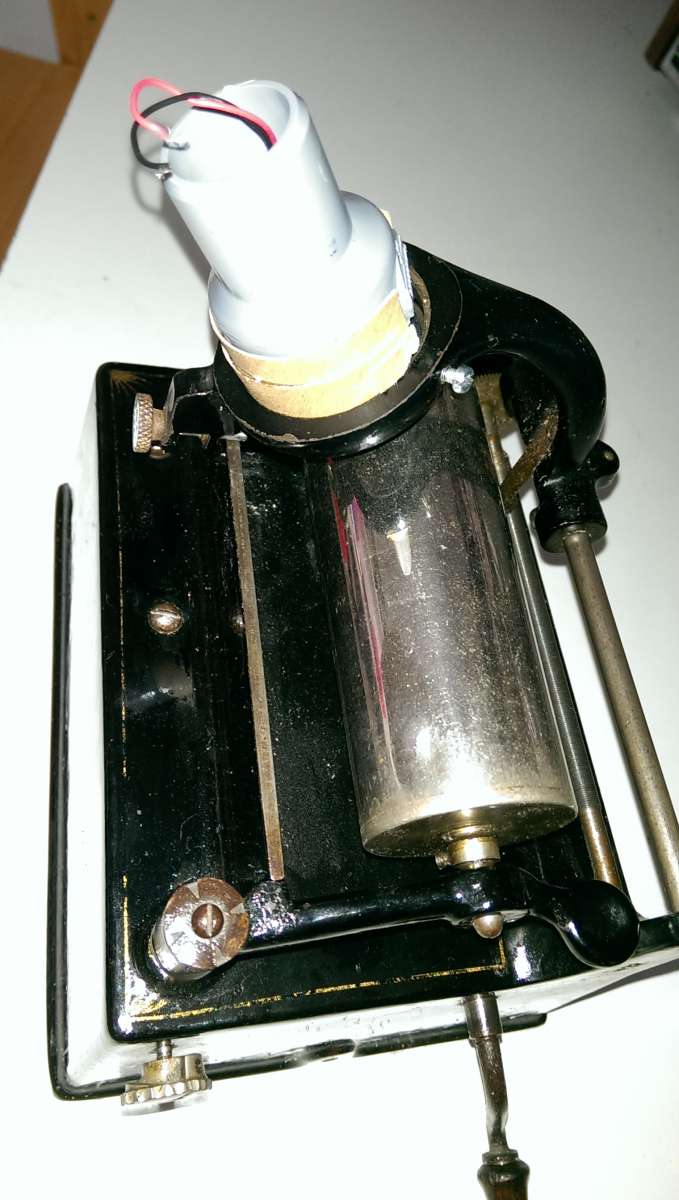 En dan een scharnier constructie zodat de beitel met de juiste druk op de wasrol drukt. Dit kostte ook heel wat praktijk experimenten voordat het bevredigend werkte.