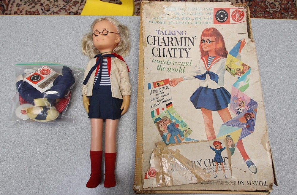 dit is een sprekende pop van mattel nl charmiing chatty cathy deze pop met ingebouwde platenspeler verschild in dit opzicht dat zij een platenslikker in haar zij heeft
