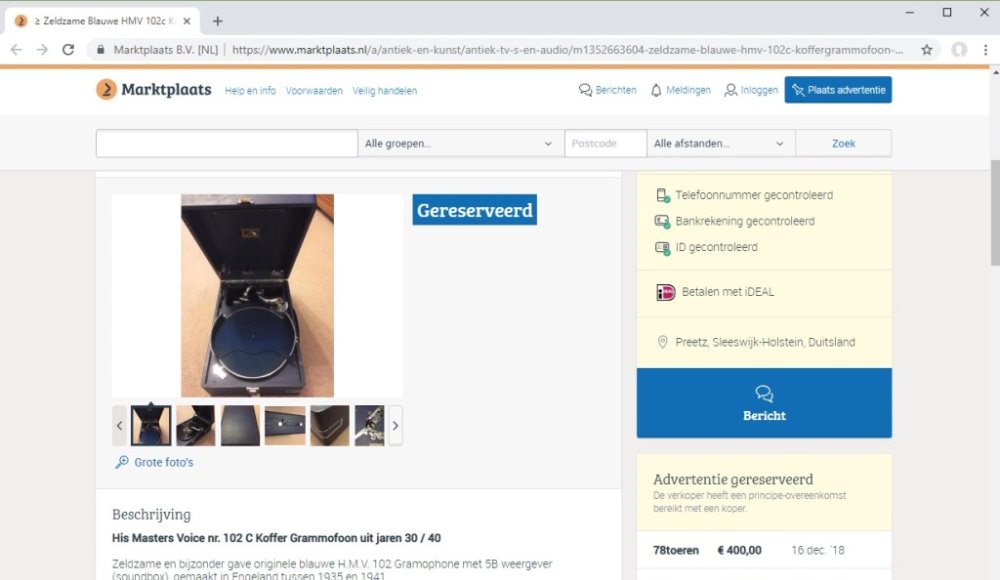 (op veilingen doet deze grammofoon gerestaureerd 500- tot 550-euro, deze is in originele staat en niet gerestaureerd )