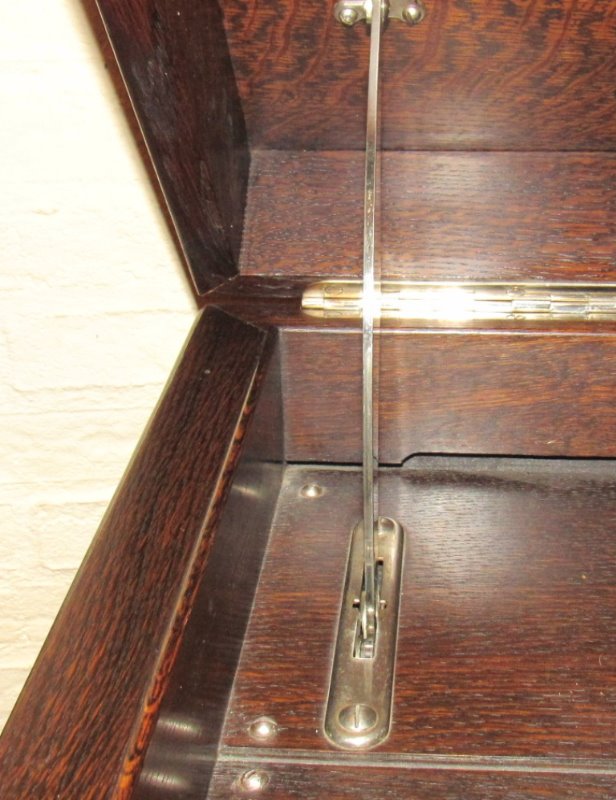 Na behandeling met donker eiken waterbeits het deksel weer op kleur gebracht.