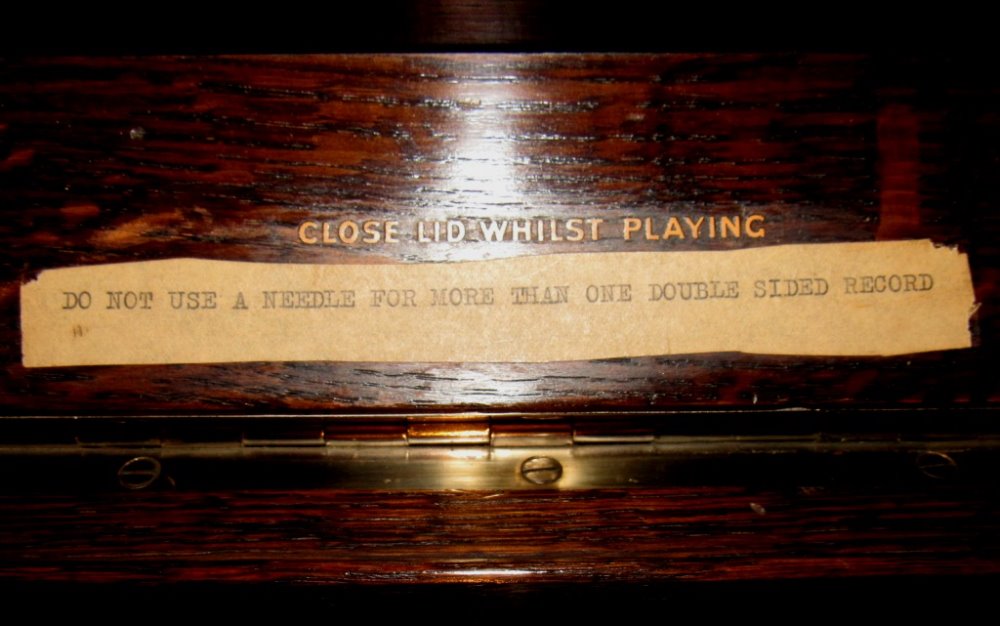 Zou ik altijd laten zitten want het is duidelijk een onderdeel van de geschiedenis van het oude apparaat. Wekt alleen maar nieuwsgierigheid op wie ooit deze tekst op een oude (toen nieuwe) typemachine heeft zitten schrijven om anderen duidelijk te maken dat men zuinig is op de platen die men bezat. Die waren immers ook al heel erg duur in de aanschaf. Bovendien stamt het waarschijnlijk nog uit de tijd dat men , bij het kopen van nieuwe platen , de oude versleten platen weer moest inleveren. Dat wilde men voorkomen met deze mededeling.