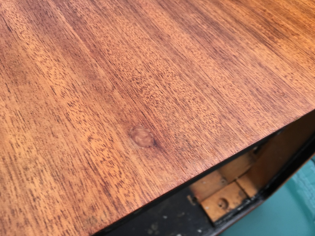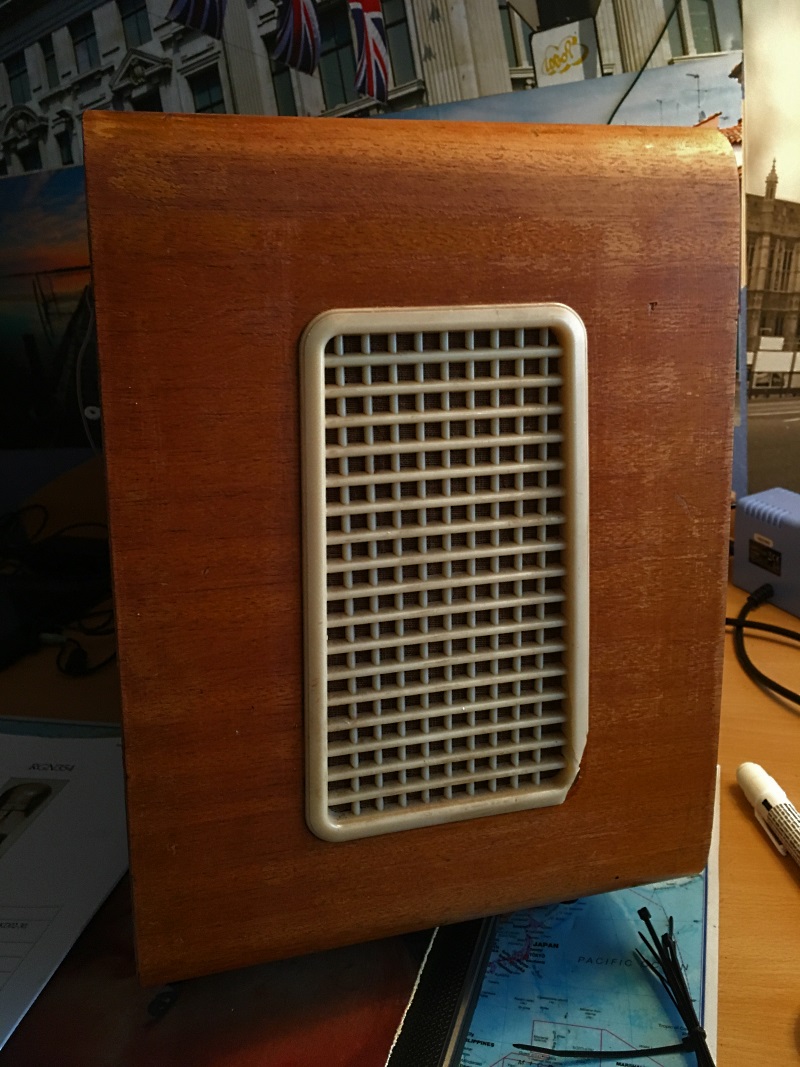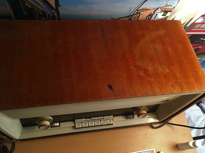 De kast ziet er niet netjes meer uit, de radio heeft nogal wat meegemaakt. Ik heb hem heel lang op mijn slaapkamer en hobbykamer gehad in het ouderlijk huis en dat heeft nogal wat sporen nagelaten. Met name een brandvlekje van de soldeerbout.
