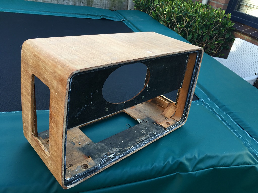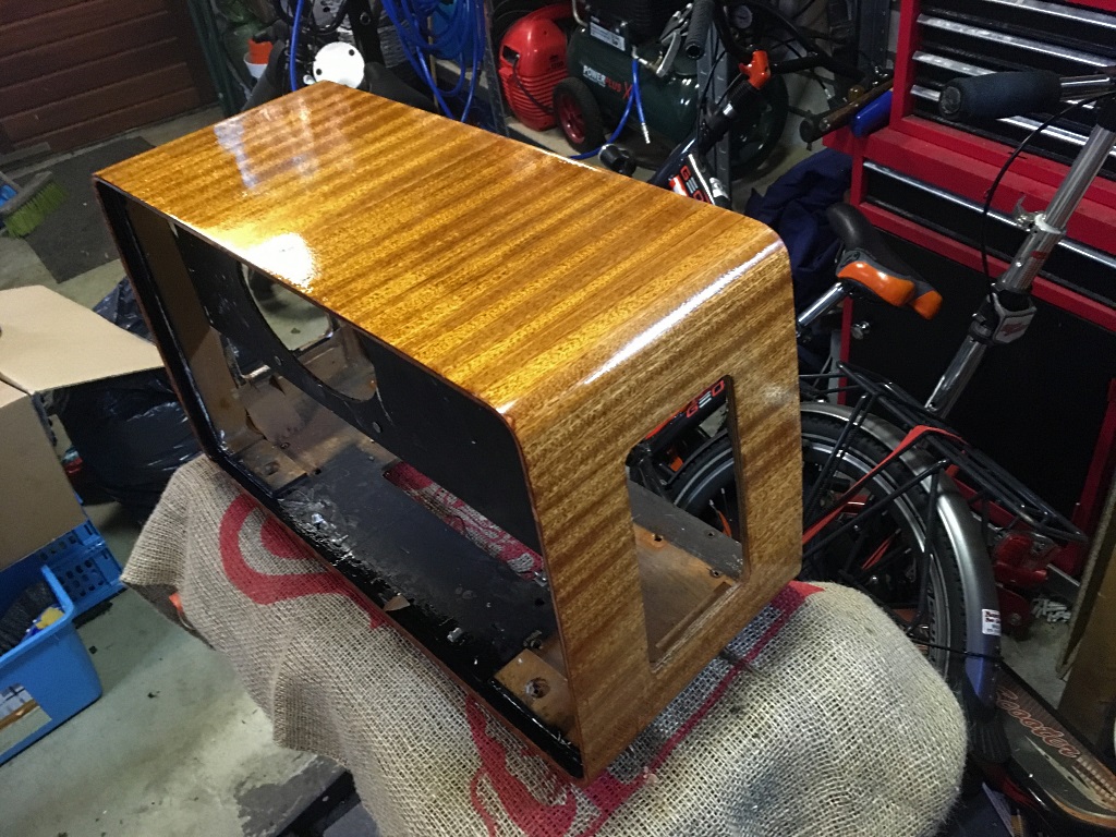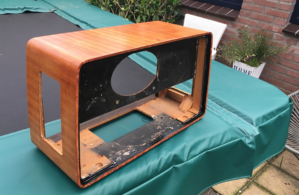 De gehele kast ontmanteld, alle lak met afbijtmiddel verwijderd, vervolgens schuren tot je een ons weegt en nu is de eerste laklaag er weer op gespoten. Ik ben geen meubelmaker, maar heb voldoende tips gekregen hoe dit aan te pakken. Nog wat laklagen te gaan en dan polijsten en dan zou het er weer netjes uit moeten zien. Het eerste resultaat is al heel aardig, vind ik zelf. Ik zou alleen de knoppen nog willen vervangen en 1 luidspreker kapje aan de zijkant is kapot. Misschien zijn er hier mensen die nog wat hebben liggen ??