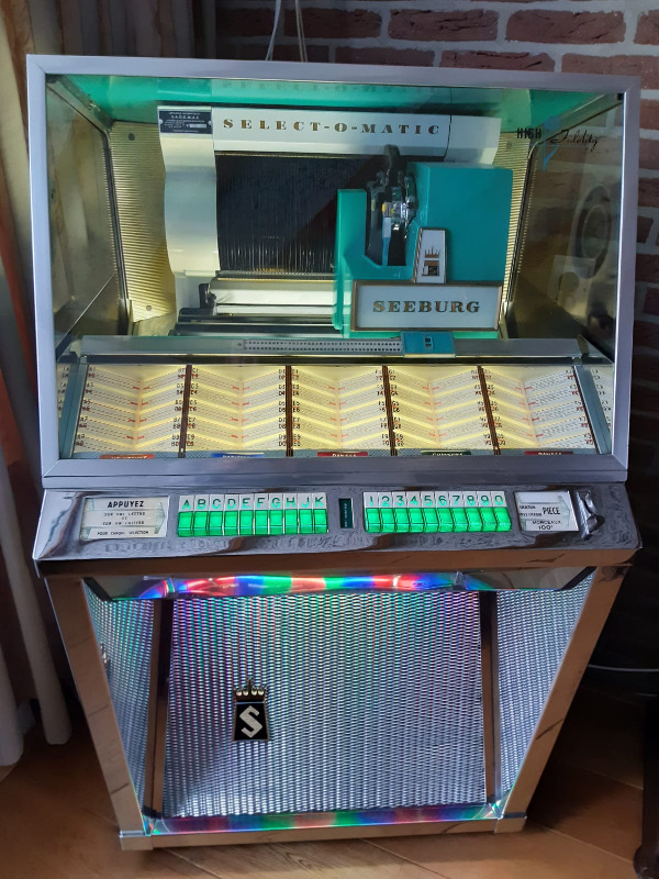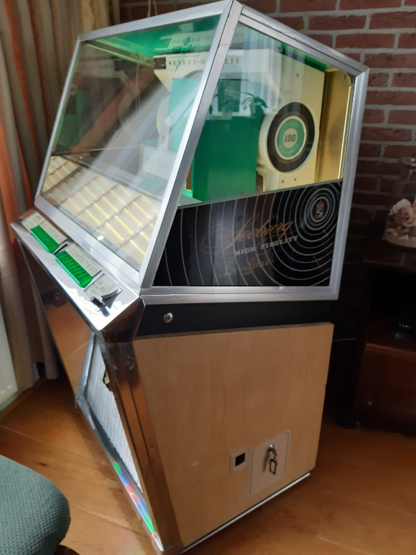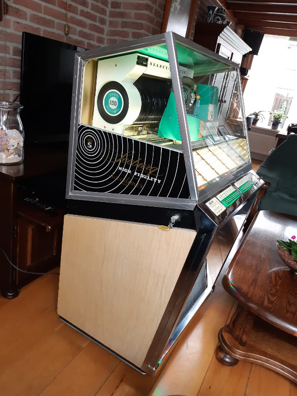Zijn Seeburg L100 de eerste jukebox die ik 27 jaar geleden voor hem gereviseerd heb en nog steeds als de beste speelt blijft in de familie en gaat naar zijn oudste zoon.