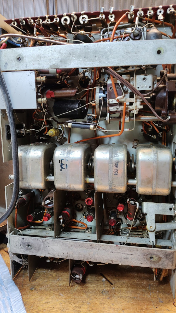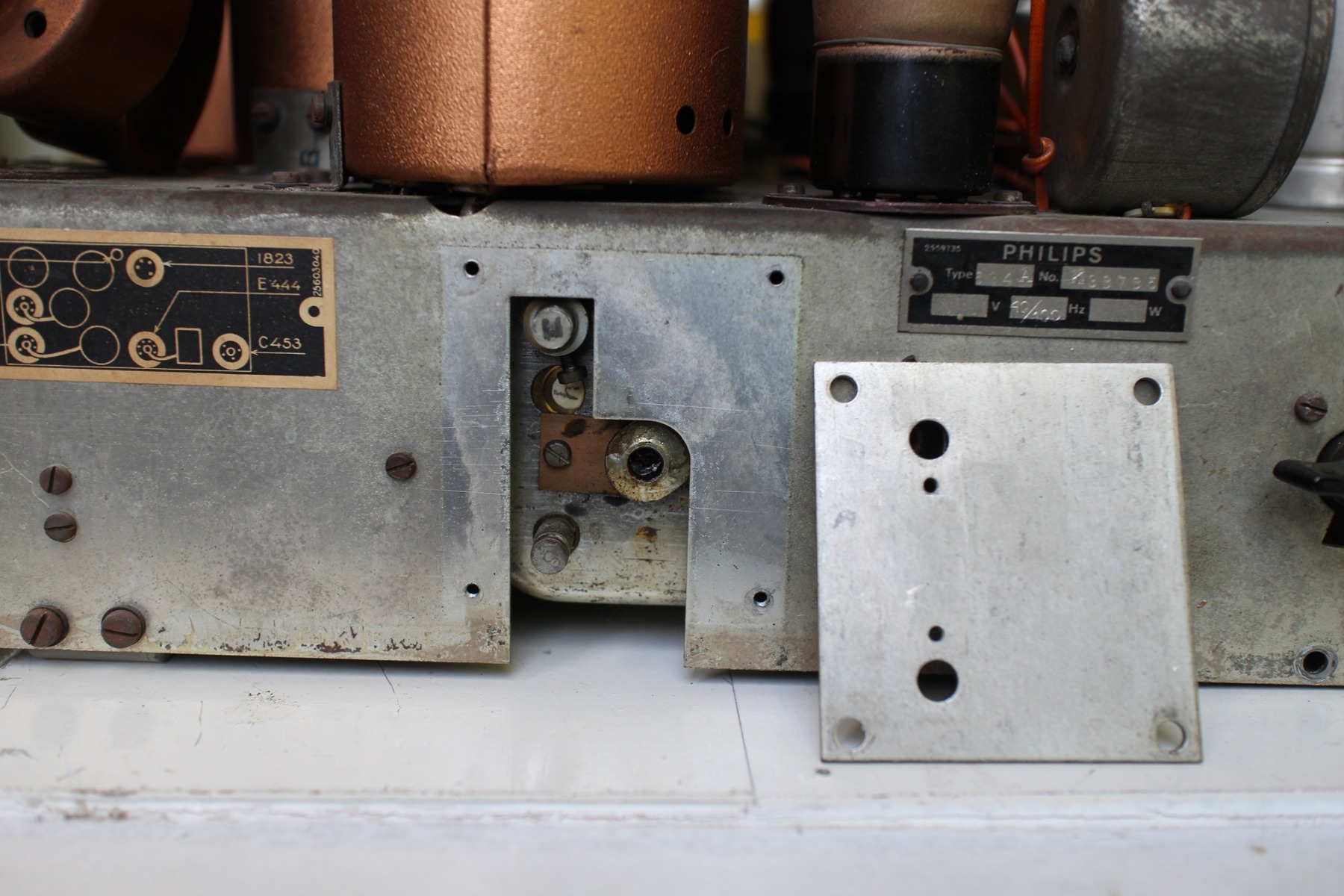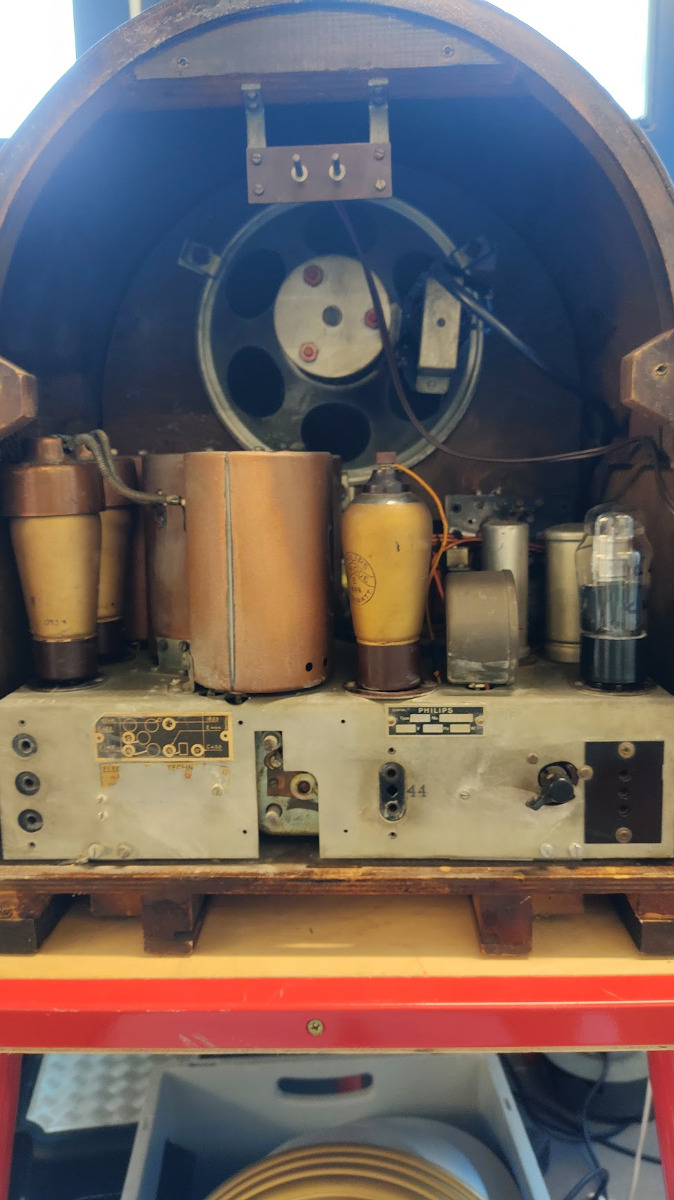 Maar nu terug naar jouw Philips 634A. Het luidsprekerdoek is origineel. Ook het chassis zit er nog heel mooi uit en zoals je al zei moet het condensatorblok gereviseerd worden.