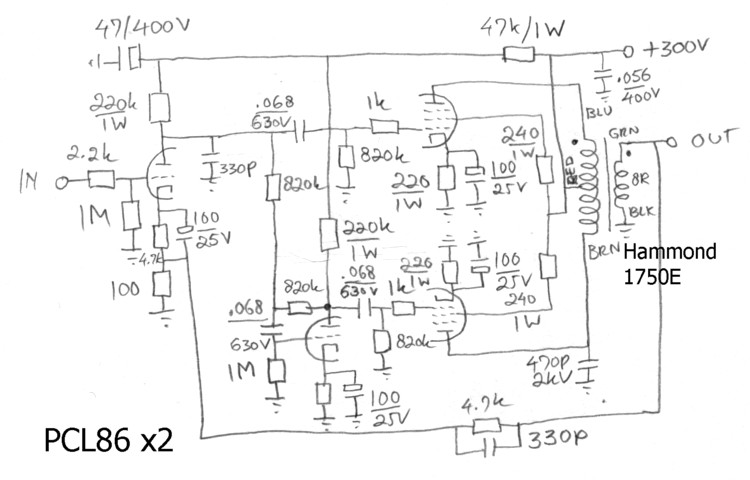 Bedacht me nog wat anders. Vond een LTP ontwerp op DIY Audio (Baby Huey) met een ECC83 en twee EL84's. Die heeft een fascinerende voeding van de phase splitter dat er om vraagt om ook geprobeerd te worden. Zie bijvoorbeeld