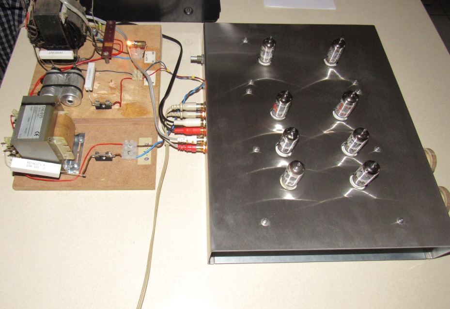 De nog te fatsoeneren voeding draait voor de gloeispanning nog op AC moet nog naar DC worden omgetoverd.
