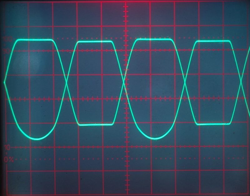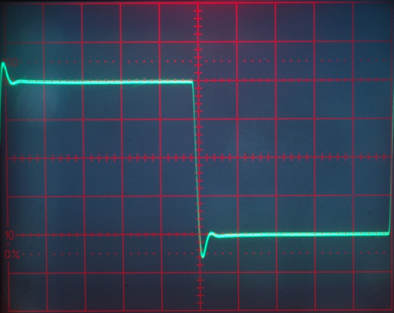Bovenste twee plaatjes zijn 50 V/div (DC) en 0.2 ms/div, onderste plaatje is 20 Vpp (AC) en 10 us/div met blokgolf in. Die overshoot had-ie eerst niet maar is te temmen door RC (Zobel) netwerkje over R2. C2 moet wat groter want de blok bij 100 Hz is nogal scheef.